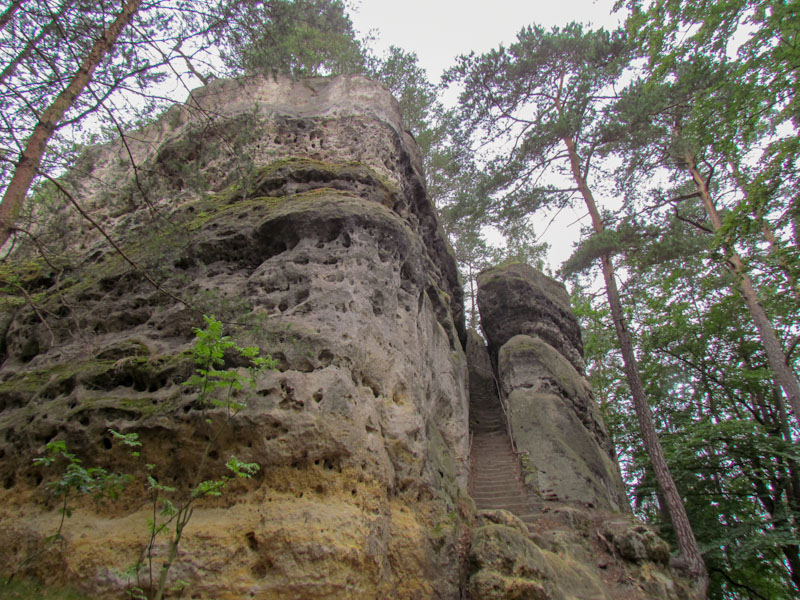 Možná si pomyslíte, že tady byste dokázali poustevničit také: výhledy z vrcholu jsou fantastické, na dosah ruky trčí dvě homole Hamerského Špičáku a Děvína, kousek dál ční monumentální Ralsko a úplně vzadu Bezděz a Ještěd. Jste uprostřed všeho. Přes údolí spatříte v úrovni očí jako zeď rovnou řadu okrajových pískovcových skal s čepicí z borů. Jde o Dlouhý kámen, zvaný také Titanic – rozměry jsou údajně shodné.