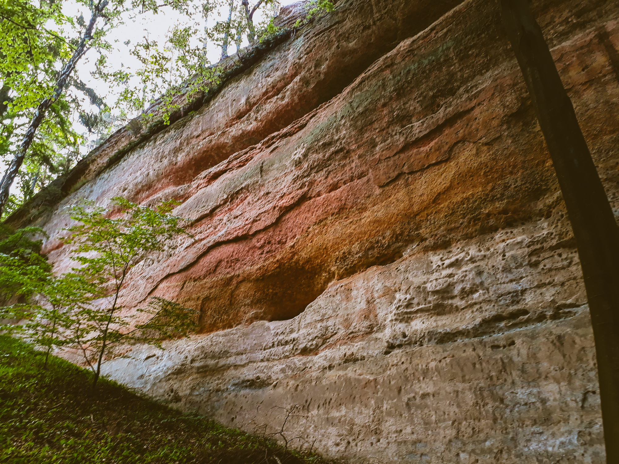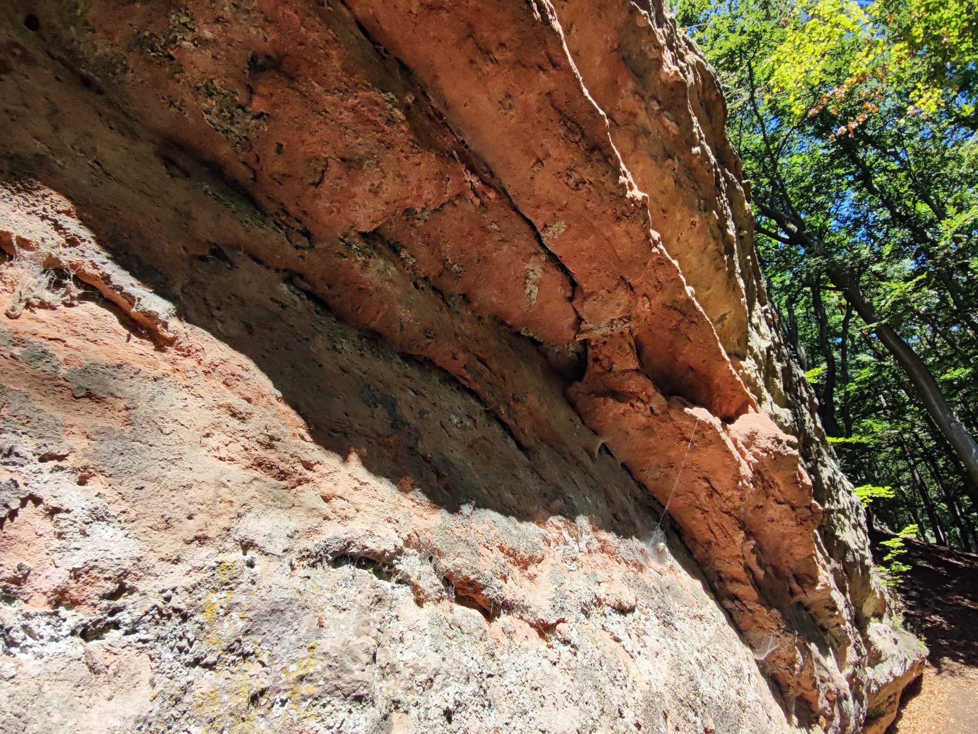 vysoké pískovcové stěny s nápadně barevnou vrstevnatostí