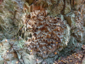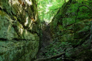 Čerstvé skalní řícení jako doklad neustálé přeměny pískovcové krajiny. Naleziště druhohorních fosilií.